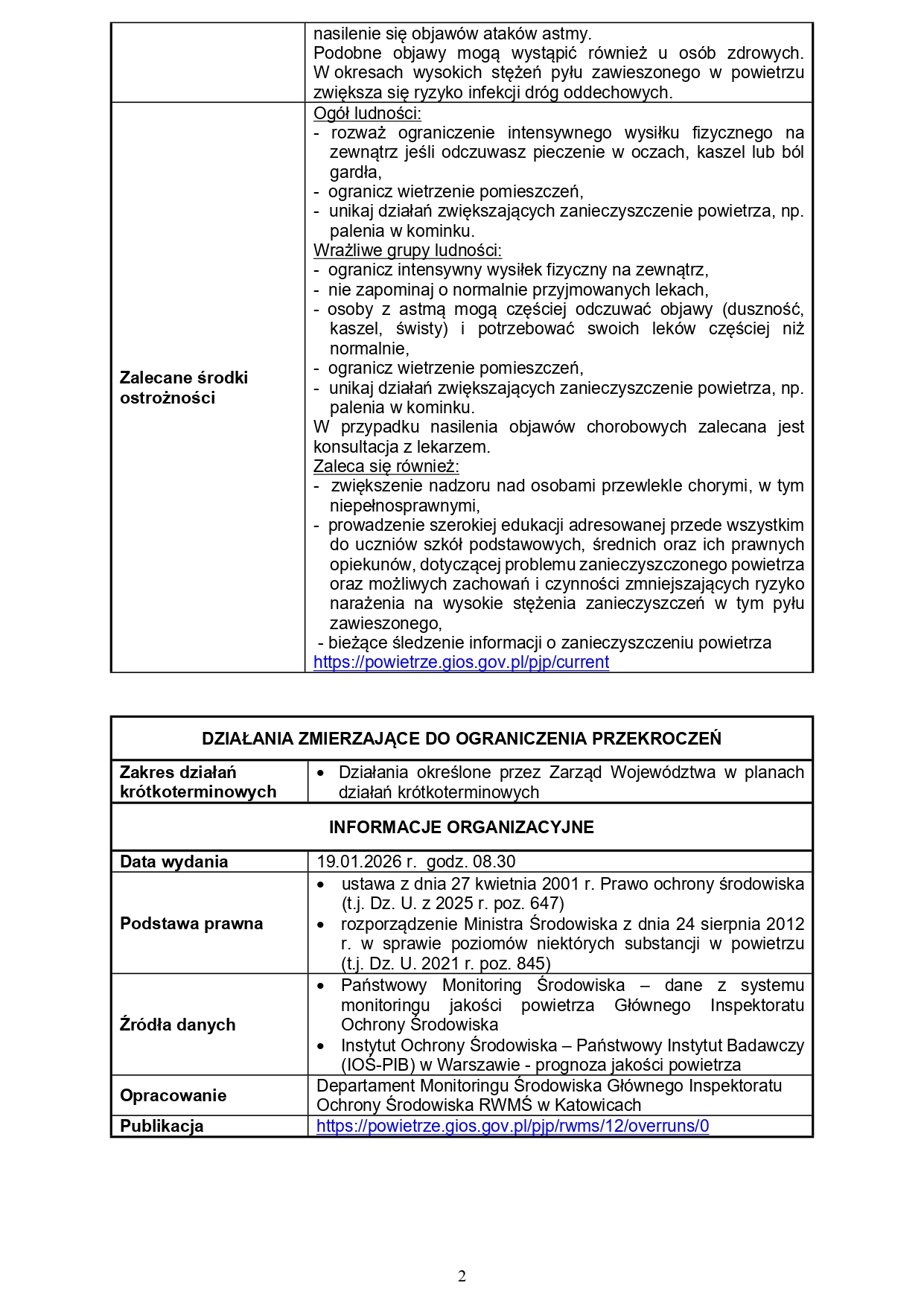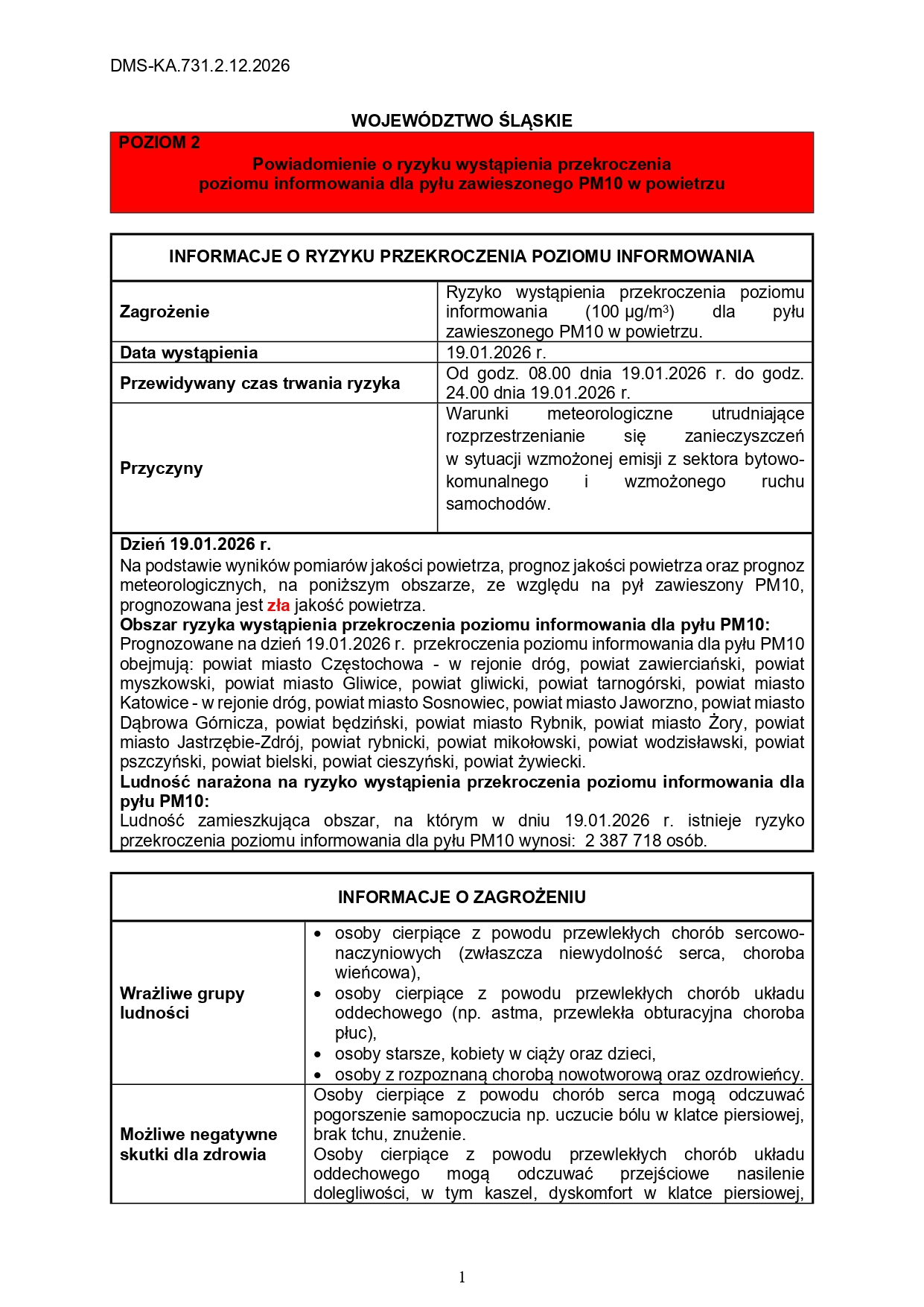 Powiadomienie o ryzyku wystąpienia przekroczenia poziomu informowania dla pyłu zawieszonego PM10 w powietrzu