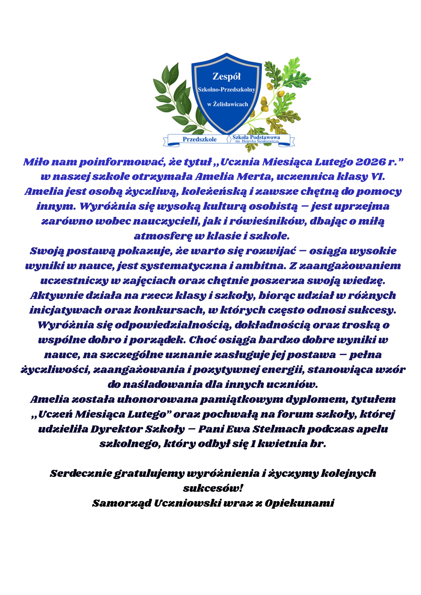 Uczeń Miesiąca - Luty