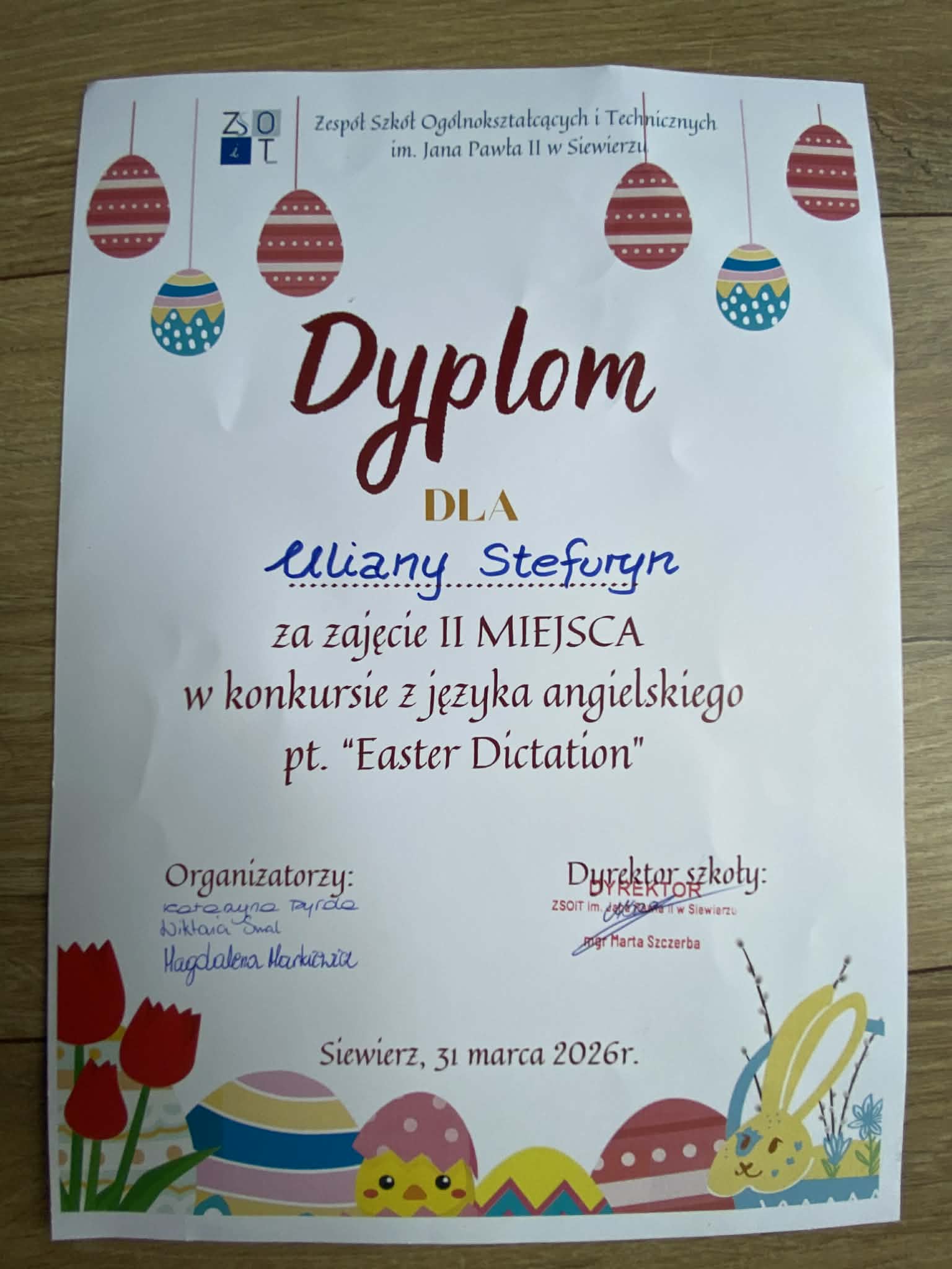 Uczennica naszej szkoły Uliana Stefuryn zdobyła II miejsce w konkursie z języka angielskiego pt. „Easter Dictation”organizowanym przez Zespół Szkół Ogólnokształcących i Technicznych im. Jana Pawła II w Siewierzu. Uliana wykazała się doskonałą znajomością języka angielskiego, wysokim poziomem poprawności ortograficznej i gramatycznej, a także dużą starannością oraz koncentracją podczas zapisu tekstu. Serdecznie gratulujemy sukcesu i życzymy dalszych osiągnięć!