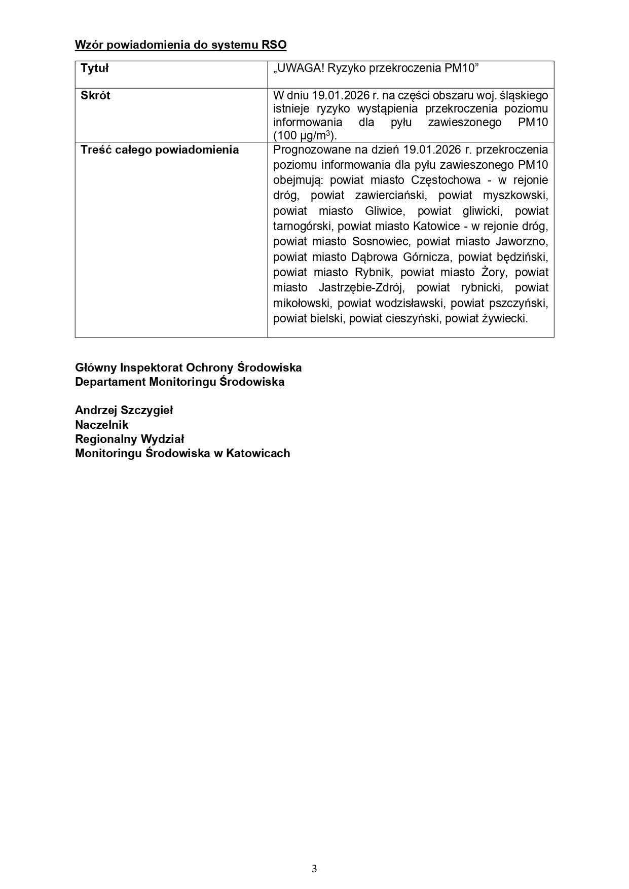 Powiadomienie o ryzyku wystąpienia przekroczenia poziomu informowania dla pyłu zawieszonego PM10 w powietrzu