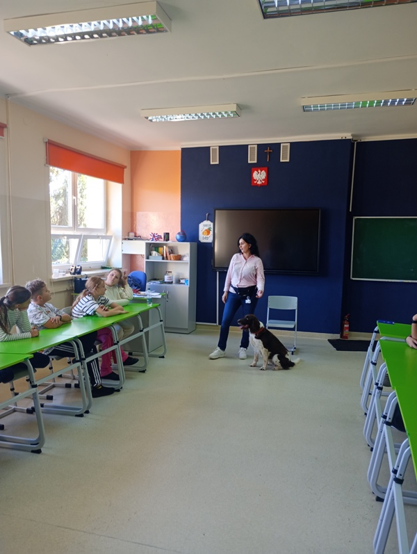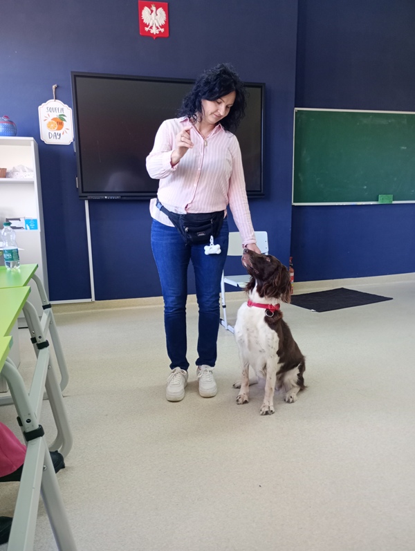 Tym razem punktem wyjścia była pasja jednej z uczennic, która interesuje się psami rasowymi.Z tej okazji zaprosiliśmy panią Katarzynę, a wraz z nią – Darę, ośmioletnią suczkę z certyfikatem pracy z dziećmi. Goście przygotowali dla klasy interesujące zajęcia z quizem, rozmową i możliwością poznania bliżej rasy Mały Münsterländer. Uczniowie z ogromnym zaangażowaniem uczestniczyliw spotkaniu, a Dara skradła serca wszystkich!